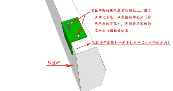 ①把馬鞍板模子放置防撞欄上,用專業(yè)的記號(hào)筆,畫出植筋的孔位(箭頭所指的孔位),再沿著馬鞍板的邊畫出馬鞍板的位置 ②依次按照2500mm(如圖所示)的間隔做好標(biāo)記 ③按照放樣的孔線位置把植筋打進(jìn)去,一定要對(duì)準(zhǔn)位置打孔 ④將立柱(立柱和馬鞍板在工廠以焊接完成)放置防撞墻上,注意將立柱植筋孔套在打下的植筋中,將立柱扶好調(diào)整好位置......